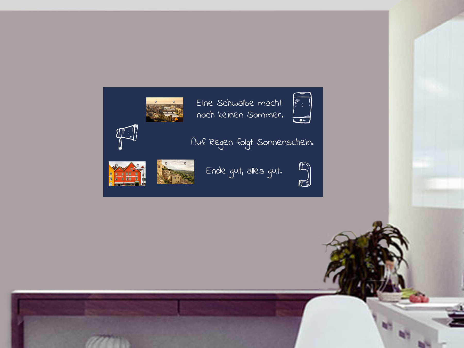 ☞ TIPP: Wenn Du nicht sicher bist ob die Folie mit der gesamten Klebefläche fest an der Wand angebracht werden kann, klebe die Folie auf eine Platte und bringen diese an die Wand an – das hat gleichzeitig den Vorteil das die selbstklebende Folie auch mal an einer anderen Stelle installiert werden kann. Wir empfehlen dafür Platten aus Kunststoff, AluDibond, Acrylglas oder Holz. Diese findest Du kostengünstig in jedem Baumarkt.